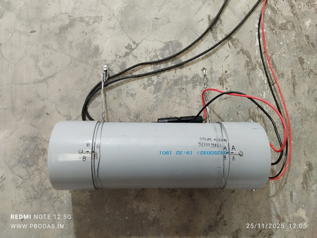 या चित्रात दिसणारी बॅटरी केवळ टेस्टींग/चाचणी साठी वापरली आहे. इन्स्टॉलेशनच्या ठिकाणी हे उपकरण थेट 36VDC सोलर पॅनल सोबत जोडायचे असते.
